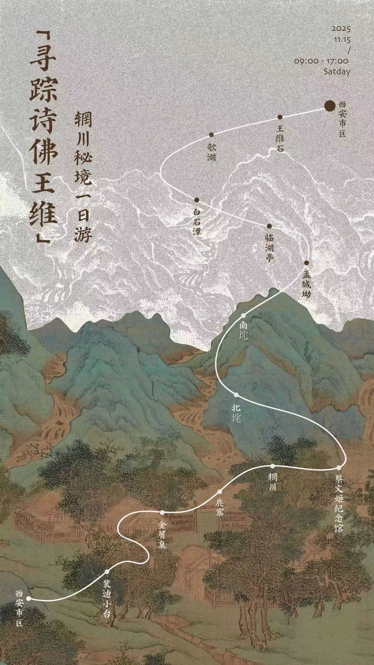 游覽由西安海外金牌導(dǎo)游全程帶隊,憑借專業(yè)講解與深度引導(dǎo),吸引了大批文博愛好者、唐詩迷及親子家庭參與。行程以王維《輞川集》詩篇為線索,從“白石灘”“欹湖”出發(fā),沿途踏訪鹿柴、孟城坳等詩中舊址,讓詩句實景躍然眼前。游客們在蔡文姬紀(jì)念館觀摩《輞川集》石刻,于水陸庵領(lǐng)略盛唐壁塑的恢宏氣象,在沉浸式行走中體悟“人閑桂花落,夜靜春山空”的禪意境界?;顒油酵瞥黾o(jì)念版文創(chuàng)產(chǎn)品,以有形載體承載詩意內(nèi)涵,延伸文化體驗。